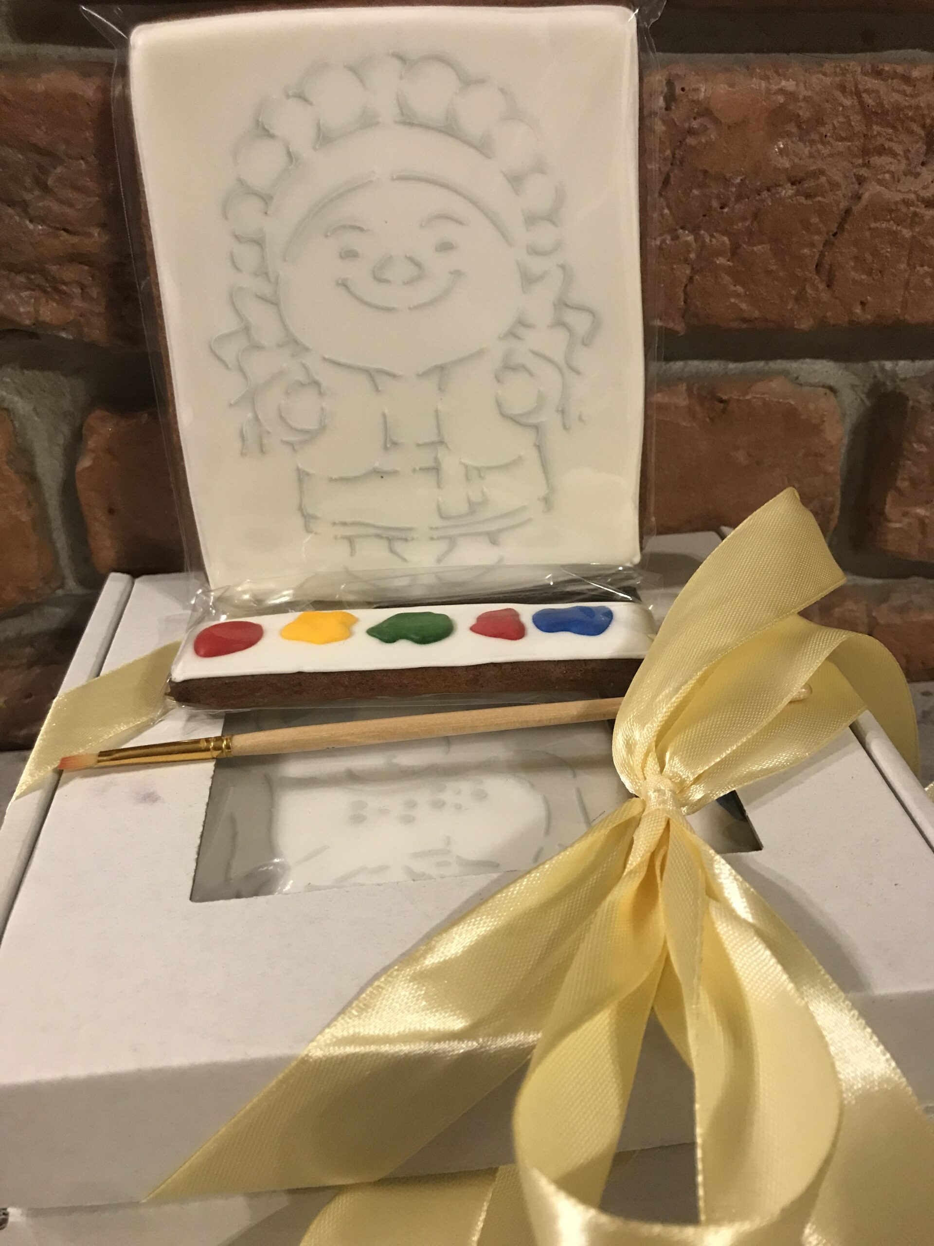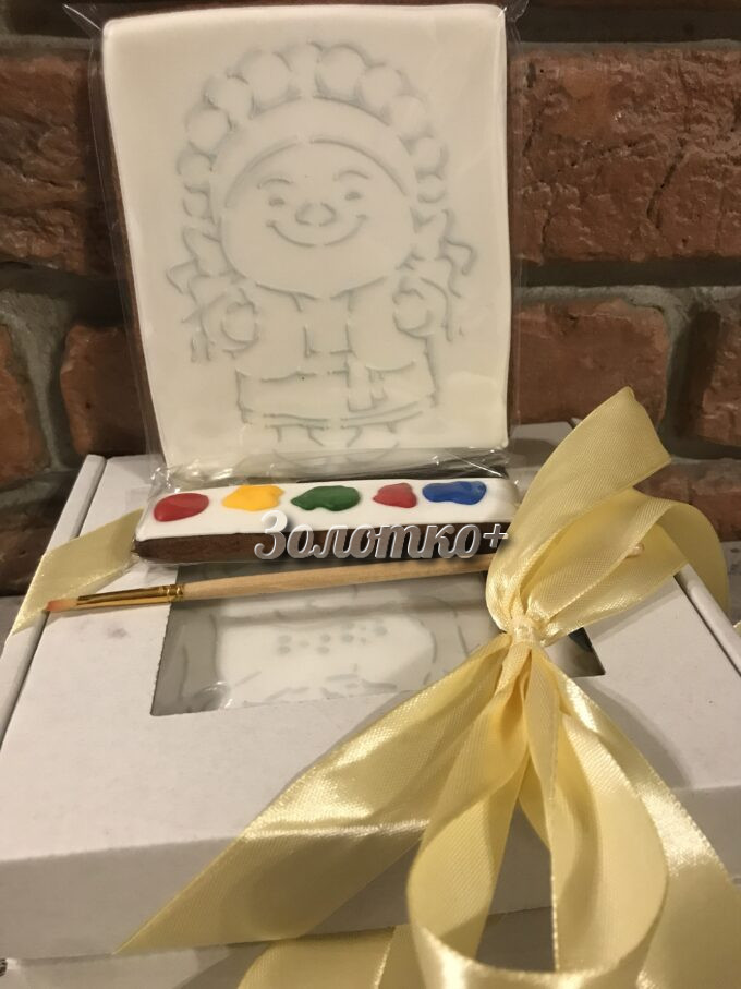 Набір Пряник-розмальовка, імбирний пряник в глазурі з малюнком улюбленого героя, який треба самостійно розмалювати. Фарби харчові і пензлик у наборі.